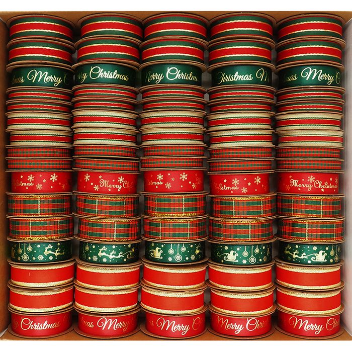 - Xmas Ribbon Box Tartan Gold 80 Roll Mix