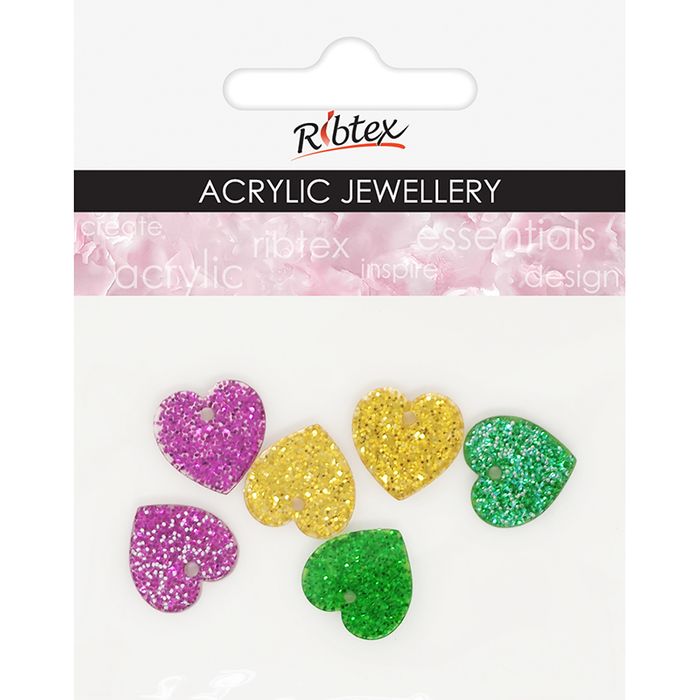 - ACRYLIC JEWEL HEART 15MM GLITTER 6PC