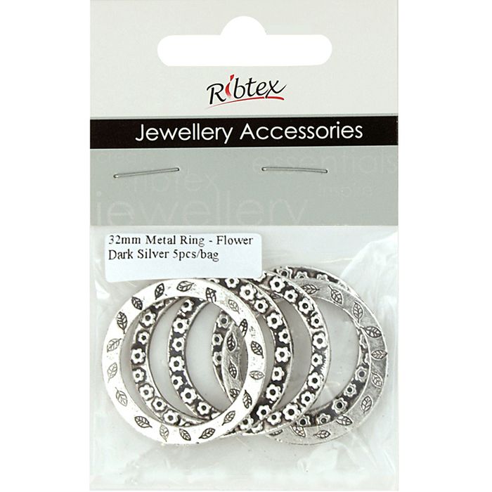 Jf Metal Ring W Flower 32Mm Dk Slv 5Pcs